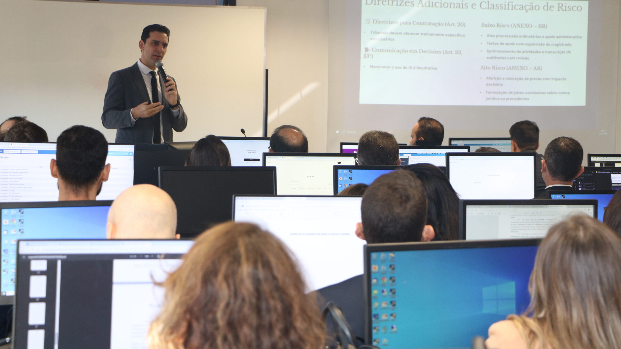 Durante as 9 horas de atividades, os participantes foram introduzidos a conceitos fundamentais de IA generativa, práticas seguras e éticas, e técnicas básicas de construção de prompts. A programação incluiu: Conceitos e aplicações jurídicas da IA generativa; introdução ao uso do ChatGPT no contexto jurídico; técnicas de estruturação de prompts claros e objetivos; práticas éticas e seguras, com ênfase na proteção de dados e criação de assistentes virtuais personalizados para apoio à gestão processual.